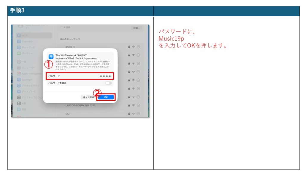 3. パスワード[Music19p]を入力し、「接続」をクリックします。