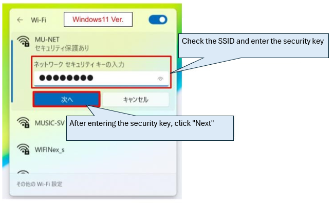 ■From April 1, 2025, a network called MU-NET-Free will be available in student halls, cafeterias, etc. to prevent the MU-NET service from being disconnected after a short time. When connecting, please enter the password listed in the file below. Please use the MUSIC network for classes.