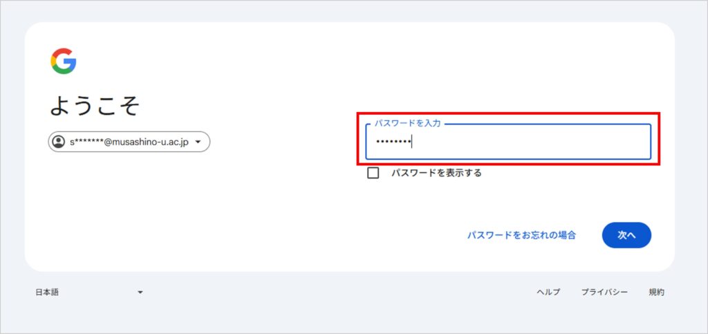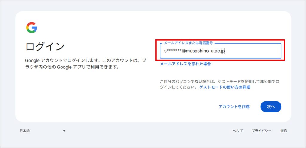 手順3 「アカウント通知書」に記載のメールアドレス[*****@musashino-u.ac.jp] を入力します。