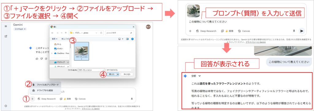 画像をアップロードして、その画像に関する質問をするには以下の手順で行います。
