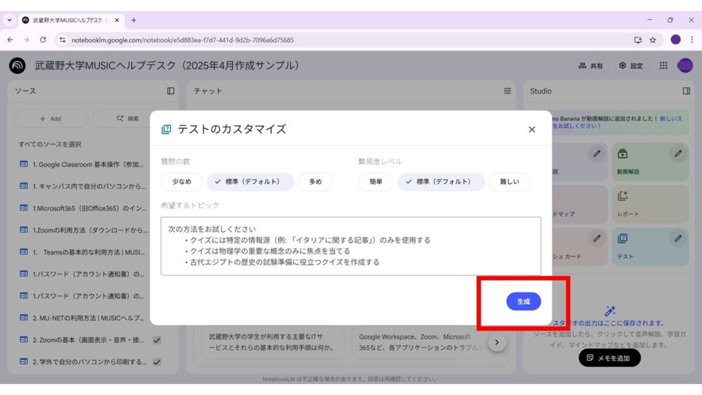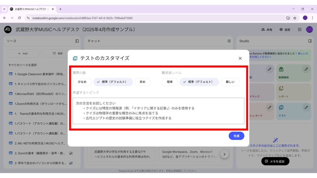 画面右側にある「Studio」パネルから「テスト」をクリックします。マークのところをクリックすると質問の数や難易度を変更できるカスタマイズ機能が利用できます。「生成」ボタンをクリックします。