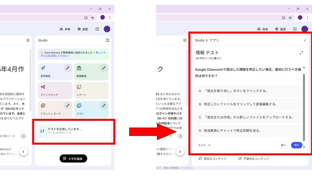 クリックすると、AIが資料を元にしたテスト問題を生成します。あとは、その問題に解答し、自分の理解度をチェックしてみましょう。