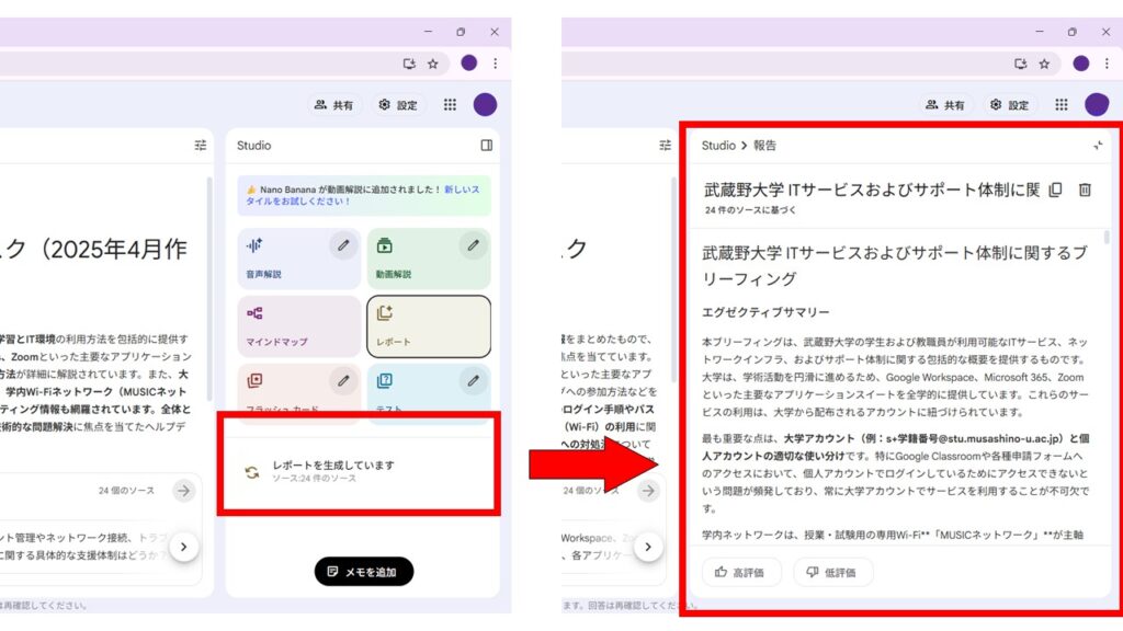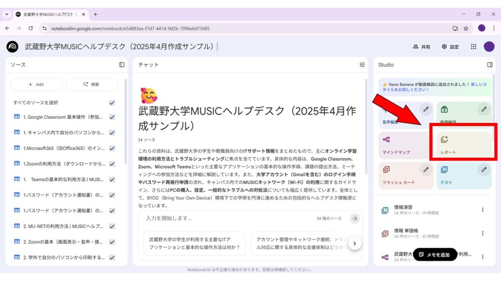 NotebookLMはアップロードした資料を「テキストのレポート」や「学習ガイド」としてまとめる機能も超強力です。重要なポイントを整理することで、学修を深めるためにより効果的に活用できます。