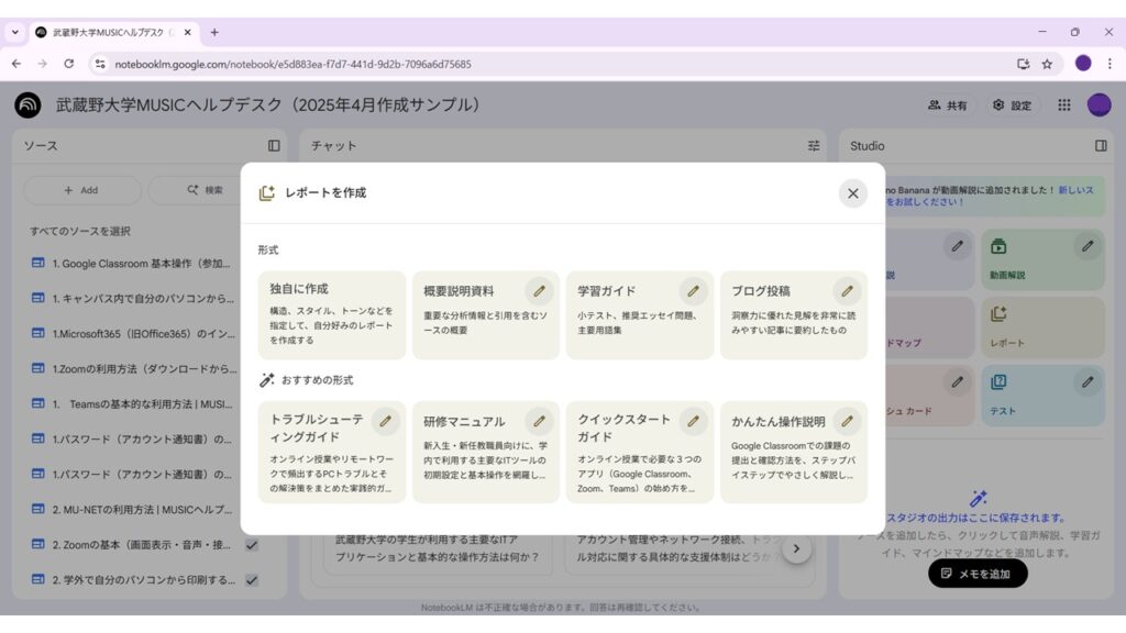 「学習ガイド」「FAQ」「概要説明資料」など、作成したいレポートの形式を選んでクリックします。AIが資料の分析を開始し、指定された形式のレポートがチャット欄やノートスペースに生成されます。